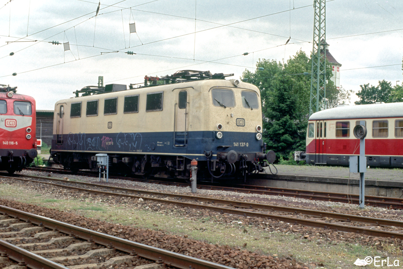 | 141 137 am 24.05.1991 auf einem südlichen Abstellgleis im Hbf. Heidelberg. Rechts im Hintergrund ist auf einem der US-Army vorbehaltenen Gleis das US-Kurierfahrzeug 633 802 zu erkennen. | |