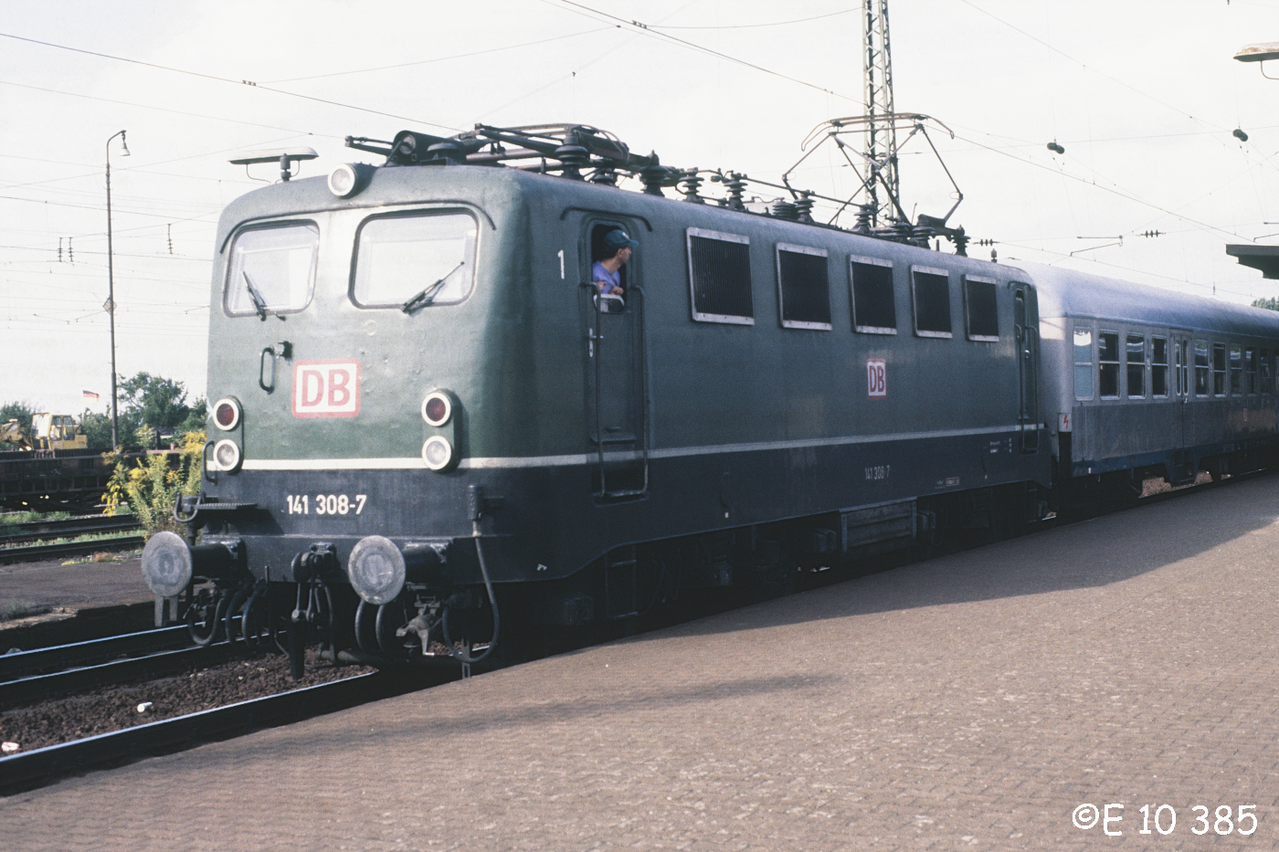 | Fertig zur Abfahrt: 141 308, von Weinheim kommend, am 01.09.1994 im Bf. Mannheim-Friedrichsfeld. | |