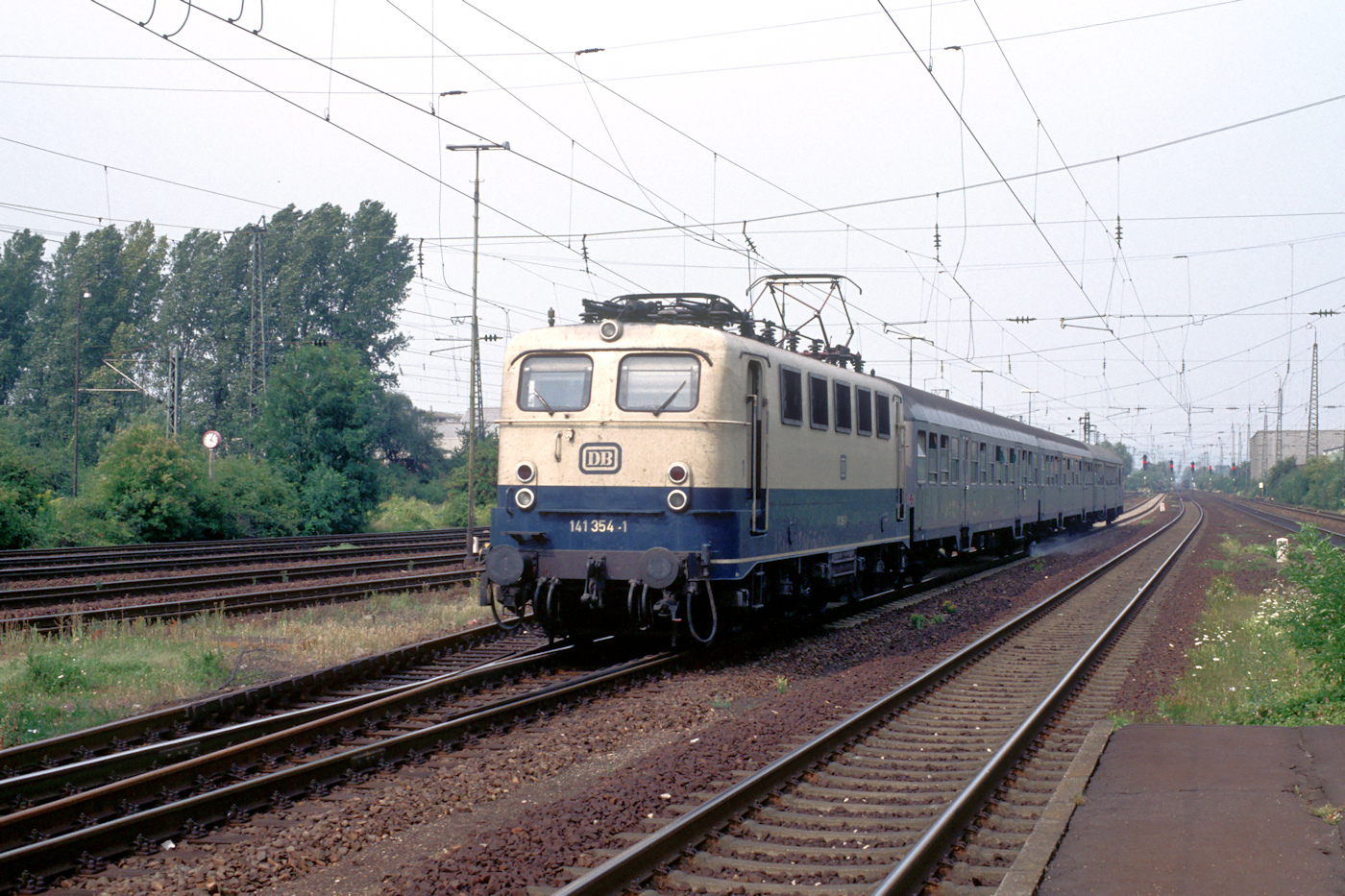 | 141 354 - noch mit waagrechter Umlaufgriffstange - fährt mit einem Nahverkehrszug am 05.08.1990 in den Bf. Mannheim-Friedrichsfeld ein. | |