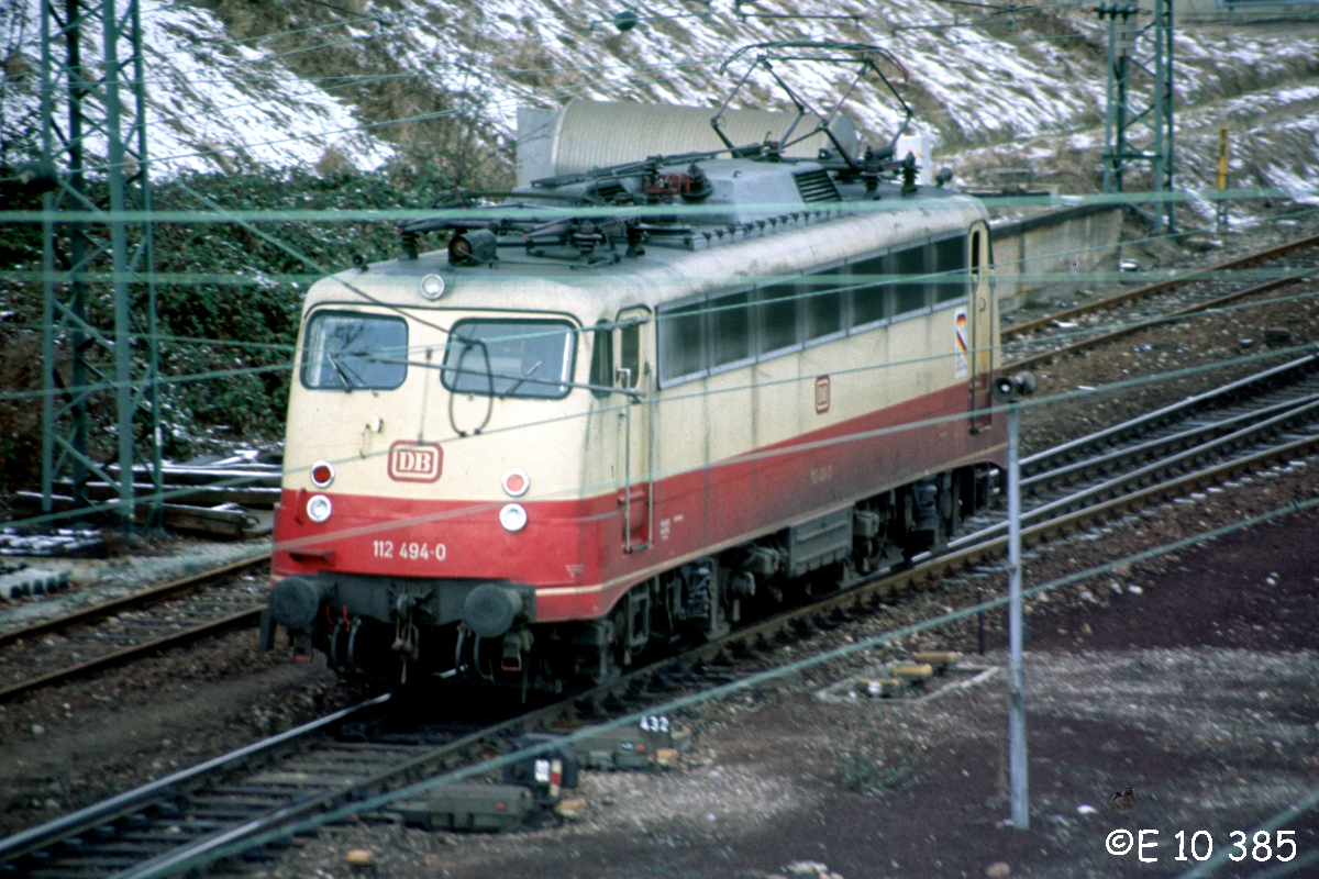 Am 05.01.1986 entstand westlich des Hbf. Heidelberg diese Aufnahme der rot/beigen 112 494.