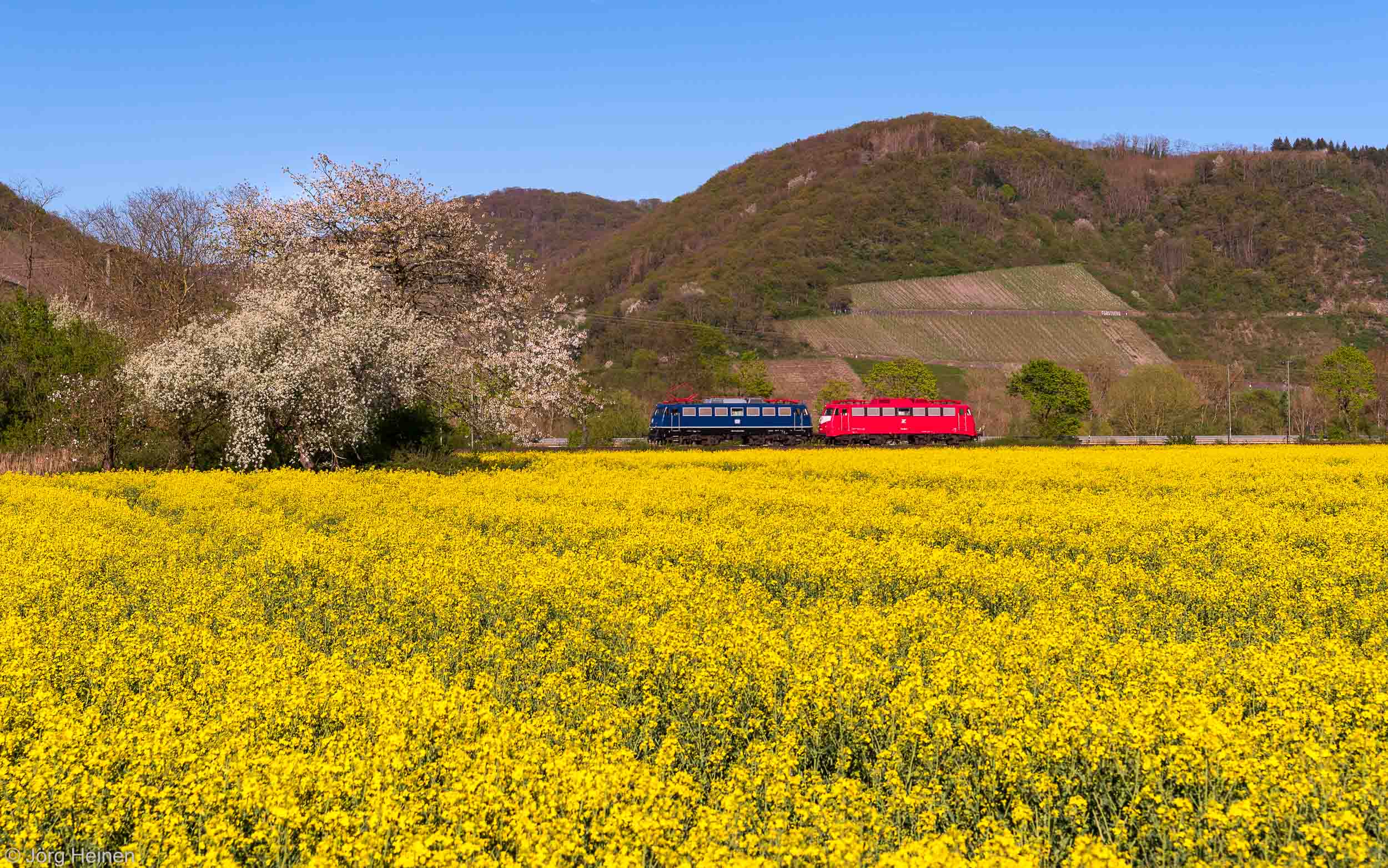 | Namedy (Ortsteil von Andernach) km 68,6, linke Rheinstrecke (KBS470); 110 428 (stahlblau, TRI) und 110 459 (orientrot, GfF) als DLr 9420 Koblenz - Lützel Museum nach Köln. Rückfahrt der Gastlokomotiven von den Einheitsloktagen des E10 e.V. im DB Museum Koblenz. Die Natur steht am Oster-Montag bereits in voller Blüte. Aufgenommen am 18.04.2022 um 17:56 Uhr. | |