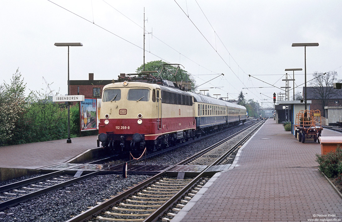 Am 1.5.1984 hat Dietmar Fiedel die Hamburger 112 268 mit dem D2245 (Henglo - Braunschweig) am Haken in Ibbenbüren fotografiert.
