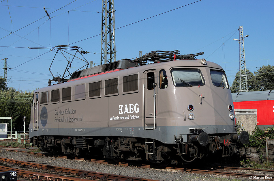 | Seit Anfang Oktober 2010 gibt es eine neue Werbe-110. Die 110 457 ist auserkoren, mit dem AEG-Werbezug auf Tour zu "gehen". Ob den Verantwortlichen bekannt ist, dass der elektrische Teil der Lokomotive von Siemens stammt ....? | |