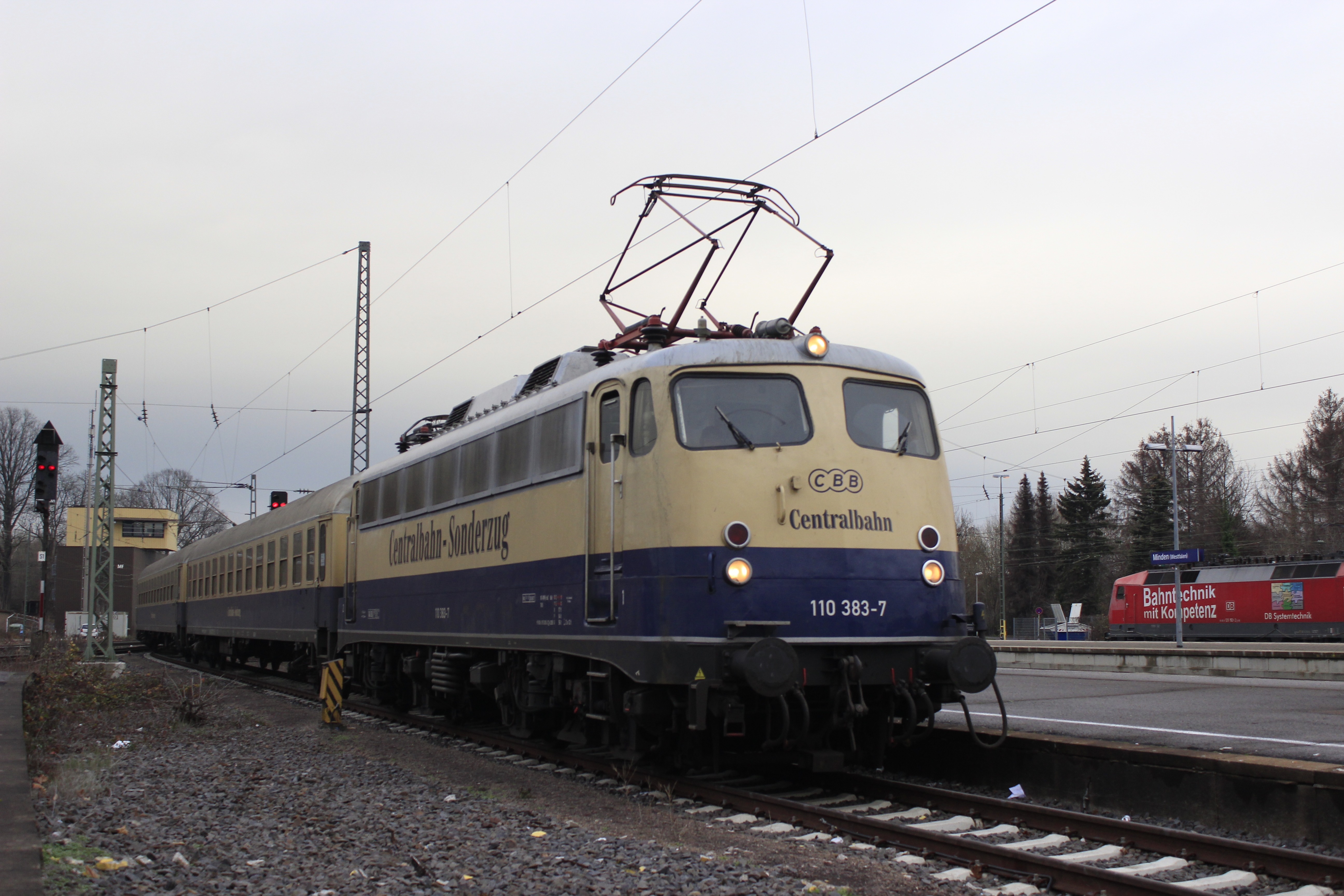 | ´´Bahntechnik mit Kompetenz´´ schmückt die Seitenwand der im Hintergrund stehenden 120 153, könnte durchaus aber auch auf die zuverlässige Einheitslok 110 383 zutreffen, welche grade ihren Ersatzzug in den Bahnhof Minden (westf.) zieht. | |