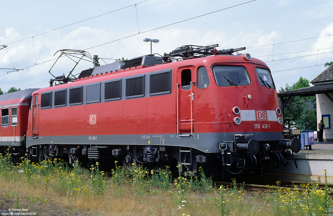 | Zwischen Mai 1999 und November 2000 bespannten wendezugfähige Lokomotiven der Baureihe 110 die S12 zwischen Köln und Au (Sieg). Am 2.7.2000 habe ich die, mir einer Zugzielanzeige ausgerüsteten, 110 418 in Hennef (Sieg) fotografiert. | |