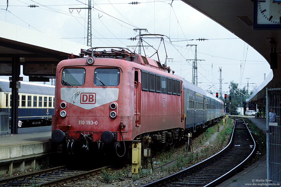 | Mit dem RE19920 nach Stuttgart steht die 110 193 abfahrbereit in Nürnberg Hbf. 7.8.2000. Obwohl die letzte Hauptuntersuchung mit Neulackierung erst acht Jahre zurücklag, war der Lack schon sehr verblichen. | |