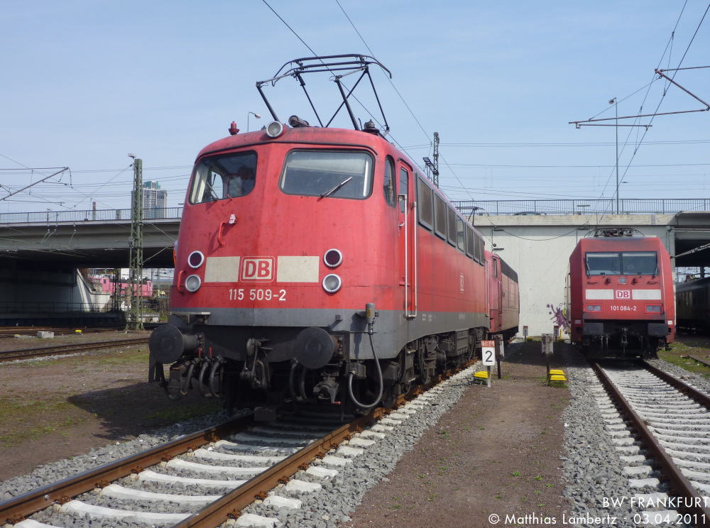 | Als Sonnenanbeterin verbrachte die 115 509-2 am 03.04.2011 einige Stunden auf Gleis 184 von Frankfurt (Main), bis eine 181er hinter ihr herausrangiert werden mußte. | |