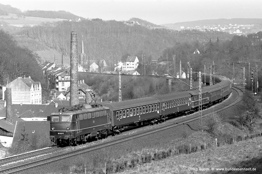 | Einen klassischen D-Zug hat die Deutzerfelder 110 143 am Haken, als sie am 12.04.71 kurz hinter dem Bahnhof Ennepetal die Talseiten wechselt. Der Zuglauf vereinigt zwischen Hannover und Aachen den D112 (Berlin - Aachen) und D182 (Hannover - Paris Nord). Foto: Ulrich Budde | |