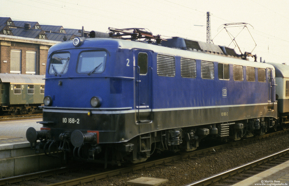 | Anfang der 80er Jahre waren Frankfurter 110 in Paderborn recht selten und so musste ich am 7.8.1983 bei der 110 168 mit einem "Blende 2,8-Foto" begnügen! | |
