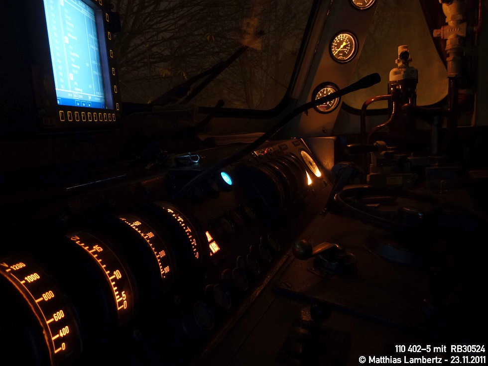 | Abendstimmung im Führerstand der 110 402-5 augenonommen beim Halt der RB35 (Düsseldorf - Emmerich) in Mehrhoog. | |