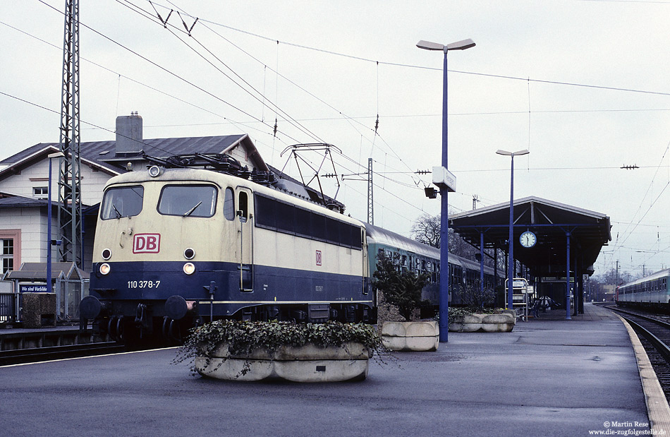 | Im März 1998 war die Hamburger 110 378 für ein paar Tage im Kölner 110-Umlauf unterwegs und konnte so mit dem SE7330 (Koblenz - Köln Deutz beim Zwischenhalt in Remagen fotografiert werden. 15.3.1998 |