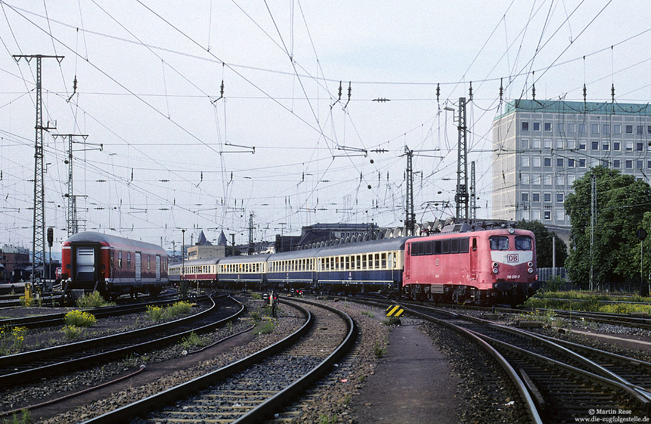 | Mit einem Sonderzug gen Süden verlässt die Stuttgarter 110 217 den Koblenzer Hauptbahnhof. 24.7.1998 | |