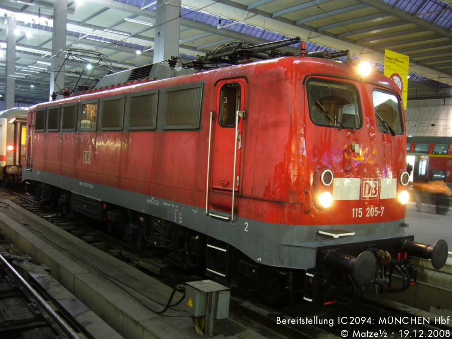 | Die 115 205 kurz nach ihrer Revision bei der Bereitstellung des IC2094 am 19.12.2009 in München Hbf. | |
