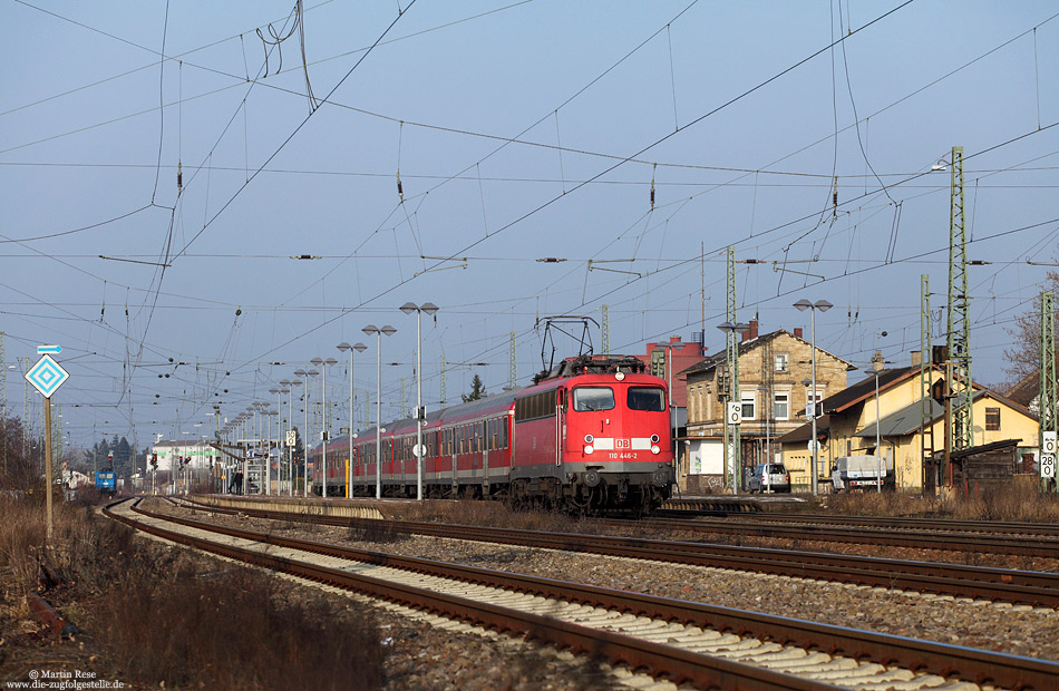 | Nachdem die Ludwigshafener 110 401 abgestellt wurde, übernahm die Stuttgarter 110 446 die Planleistungen zwischen Biblis und Karlsruhe. Am späten Nachmittag des 14.3.2012 verlässt die 110 446 mit der RB38863 nach Karlsruhe Hbf den Bahnhof Biblis. | |