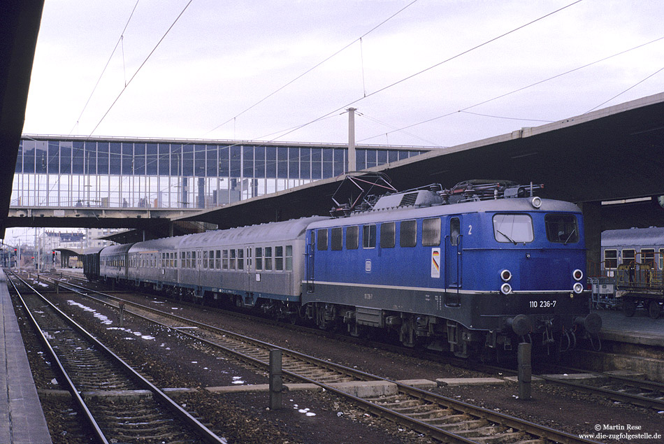 | Am 6.1.1986 habe ich die Stuttgarter 110 236 mit dem E3221 (Mannheim - Würzburg) in Heidelberg Hbf fotografiert. | |