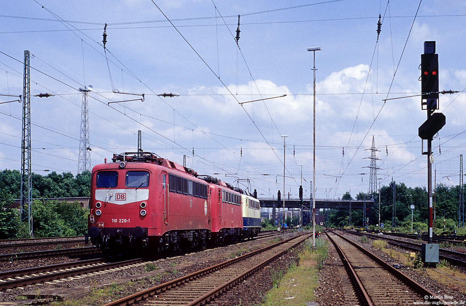 | Am 9.6.2001 hatte die 110 279 die Aufgabe die 110 220 und 110 133 von Köln Deutzerfeld nach Dessau zu überführen. Das Foto des Lokzuges (Pbz69350) entstand im Bahnhof Neubeckum. Für die beiden letztgenannten Lokomotiven war es die vorletzte Reise! Die letzte Reise führte die beiden Lokomotiven zurück in's Rheinland, zum bekannten Schrottverwerter in Opladen... |