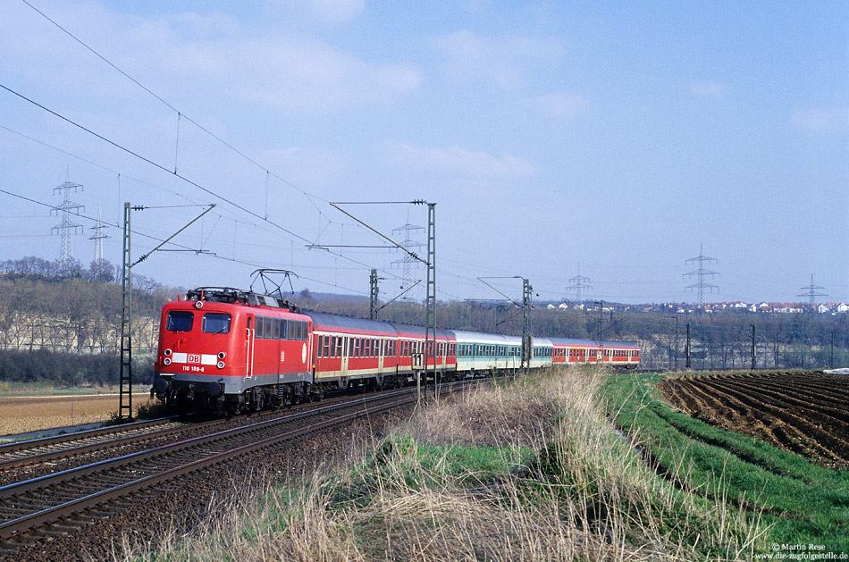 | Die 110 189 hat fast ihr ganzes Lokleben beim Bw Stuttgart verbracht. Nur etwa zweieinhalb Jahre war die Lok beim Bw München beheimatet, obwohl zuvor auch viele Züge von diesem Bw aus bespannt wurden. Am 27.3.2002 hatte die Lok mit dem RE19158 (Stuttgart - Lauda) eine typisch Stuttgarter Leistung zu erbringen. Fotografiert bei Lauffen am Neckar. | |