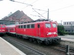 In einheitlich verkehrsrotem "Look": 141 404 mit Nahverkehrszug am 25.09.2005 im Hbf. Emden.